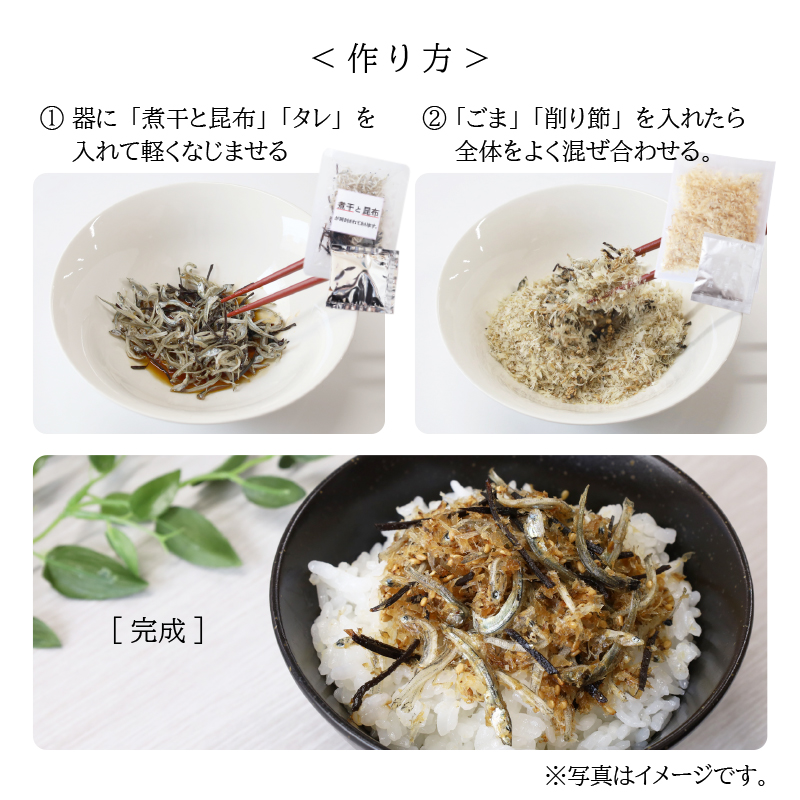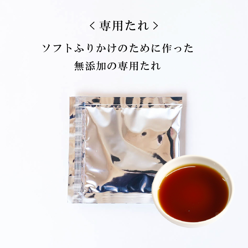 飛魚削り、煮干、昆布、ゴマの4種の具材とソフトふりかけのために作った専用の調味たれを混ぜ合わせることで、懐かしさを感じるやさしい味わいのウェットなふりかけが完成します。