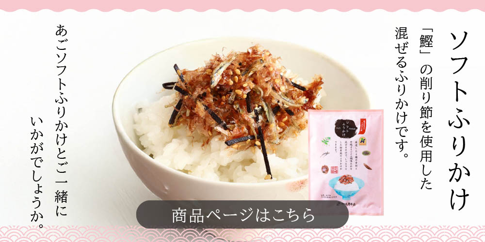 本ページの「あごソフトふりかけ」は飛魚の削り節を使用していますが、もう一つは鰹の削り節を使用しています。