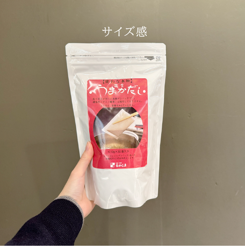 今まで「無添加のだし」といっても「酵母エキス」や「塩」が含まれているものを使っていました。「うまかだし」妊娠・出産を機に食事に気を付けるようになり、無添加のだしを探していたところ、うまかだしを見つけました。素材だけでできており、安心して使っています。また、塩も入っていないため離乳食作りにも使いたいと思っています。