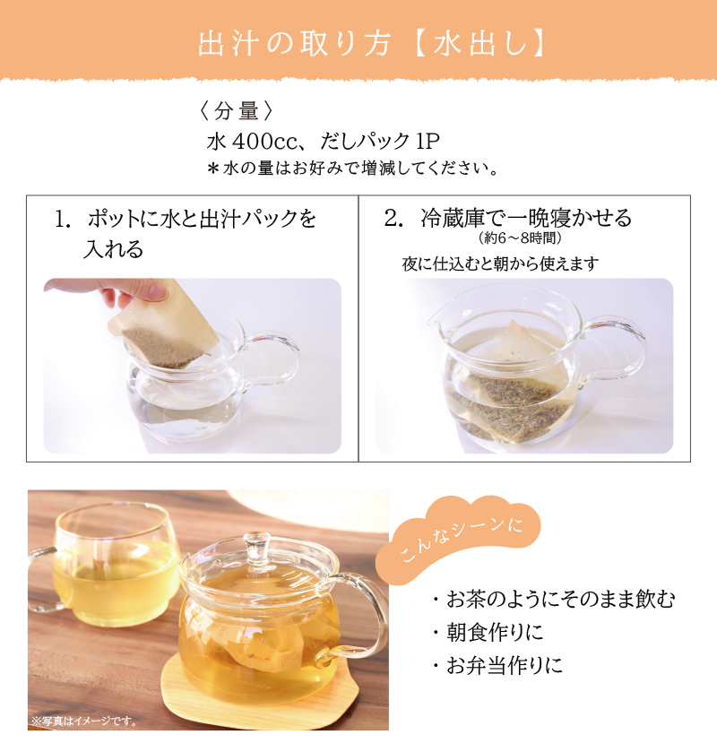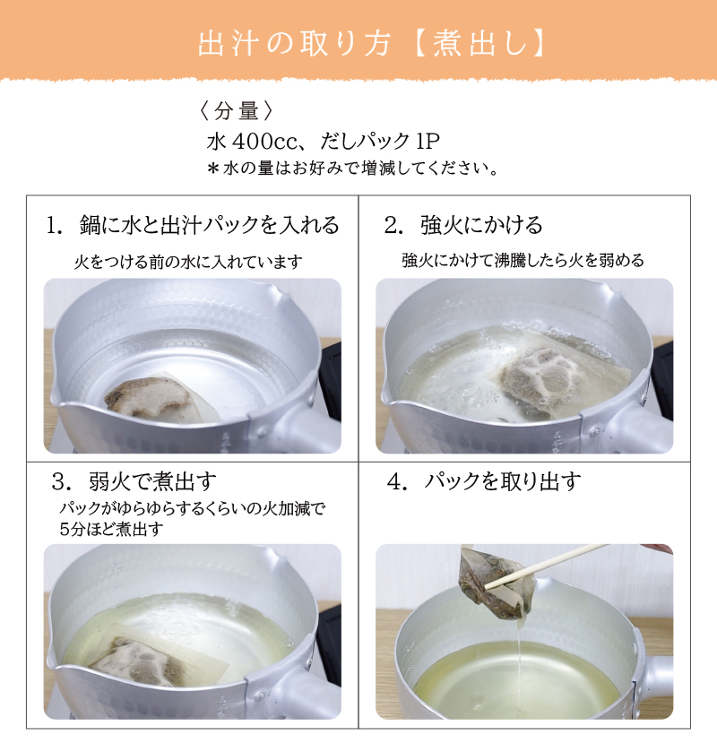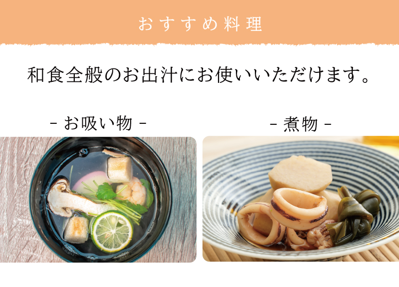 お味噌汁、煮物、お吸い物など和食全般のお出汁としてお使いいただけます。
