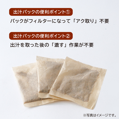製法特許取得のオリジナル魚醤で味をつけている「味付き」の出汁パックです。