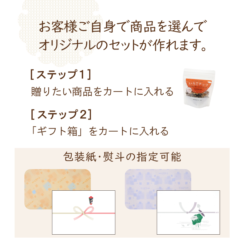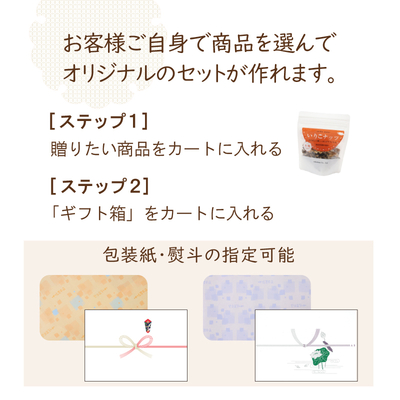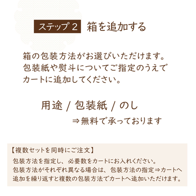 ギフト箱への包装をご希望の場合は、単品商品と一緒に本ページの「ギフト箱」をカートへ入れてご注文をお願いいたします。