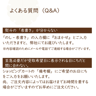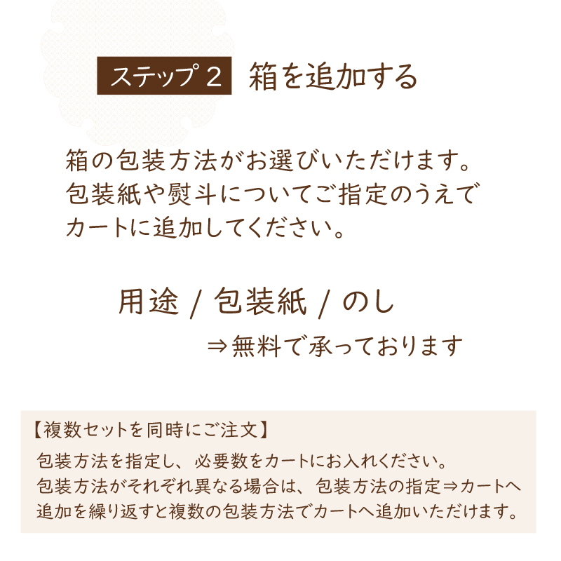複数セットご注文の場合は、カート画面の「備考欄」にギフトの内訳について詳細をご入力ください。