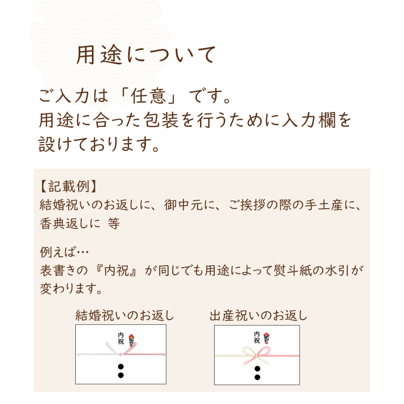 「用途」についてご入力のうえ、「のし -表書き」の入力欄に『おまかせ』とご入力ください。