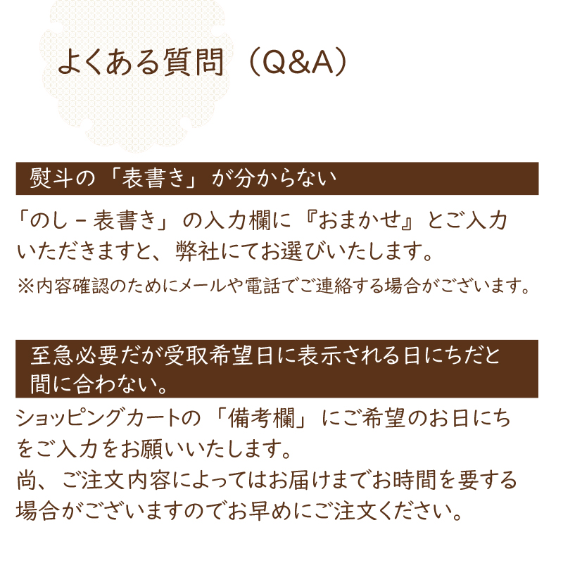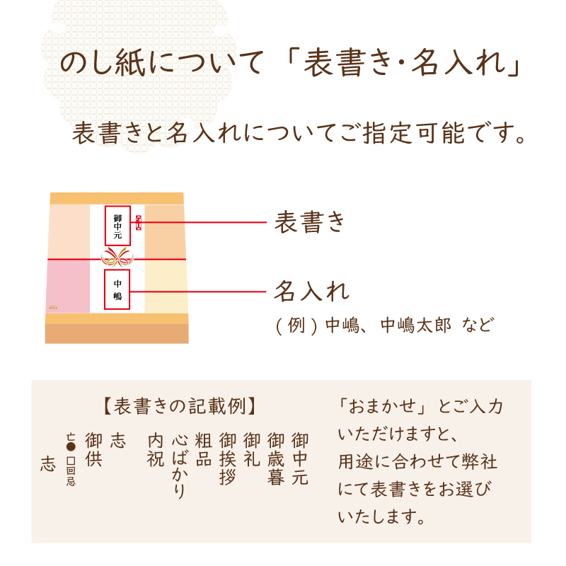 表書きの入力欄に「おまかせ」とご入力いただきますと、弊社にて用途に合った表書きお選びいたします。