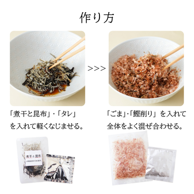 鰹削り、煮干、昆布、ゴマの4種の具材とソフトふりかけのために作った専用の調味たれを混ぜ合わせることで、懐かしさを感じるやさしい味わいのウェットなふりかけが完成します。